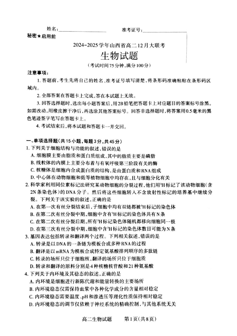 山西省晋城市2024-2025学年高二上学期12月月考生物+答案解析