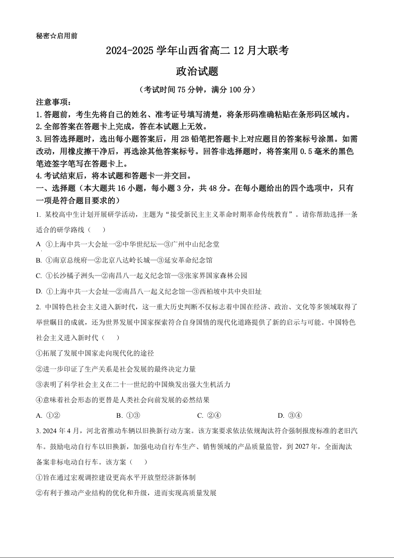 山西省晋城市2024-2025学年高二上学期12月月考政治(原卷版)