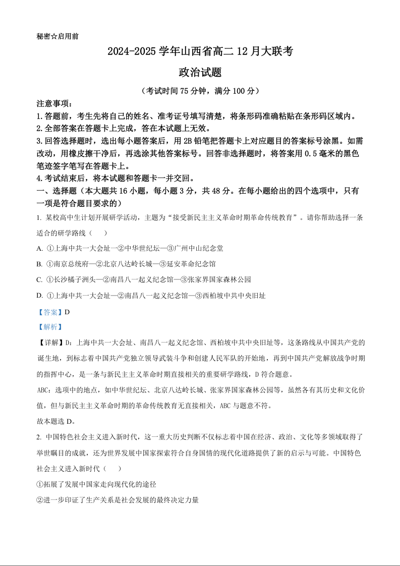 山西省晋城市2024-2025学年高二上学期12月月考政治(解析版)