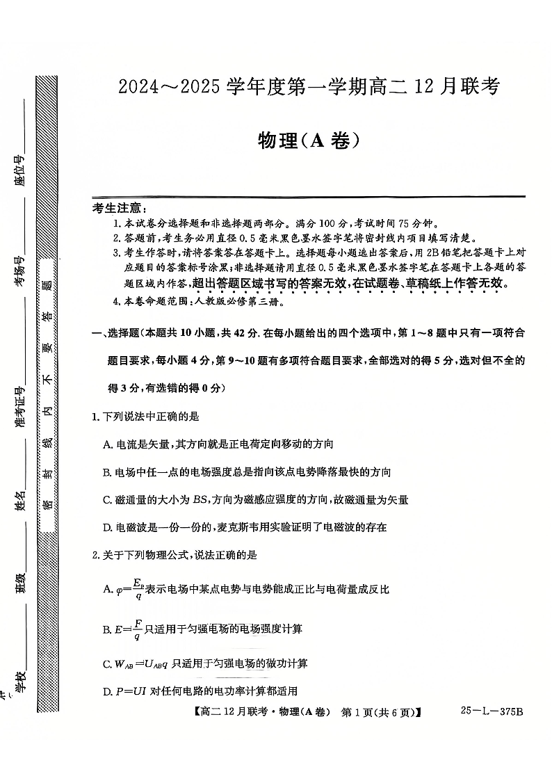 安徽省县中联盟2024-2025学年高二上学期12月月考物理