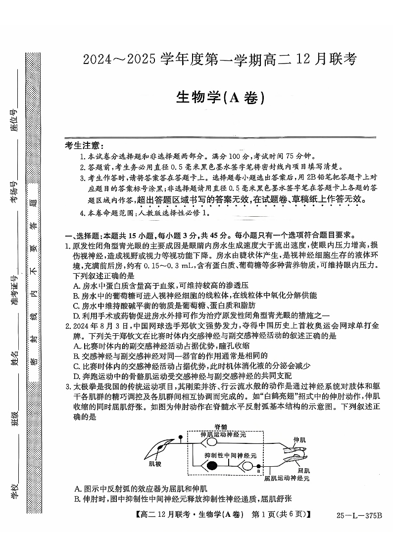 安徽省县中联盟2024-2025学年高二上学期12月月考生物