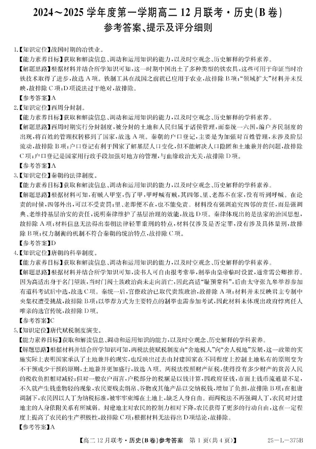 安徽省县中联盟2024-2025学年高二上学期12月月考历史(B卷)解析