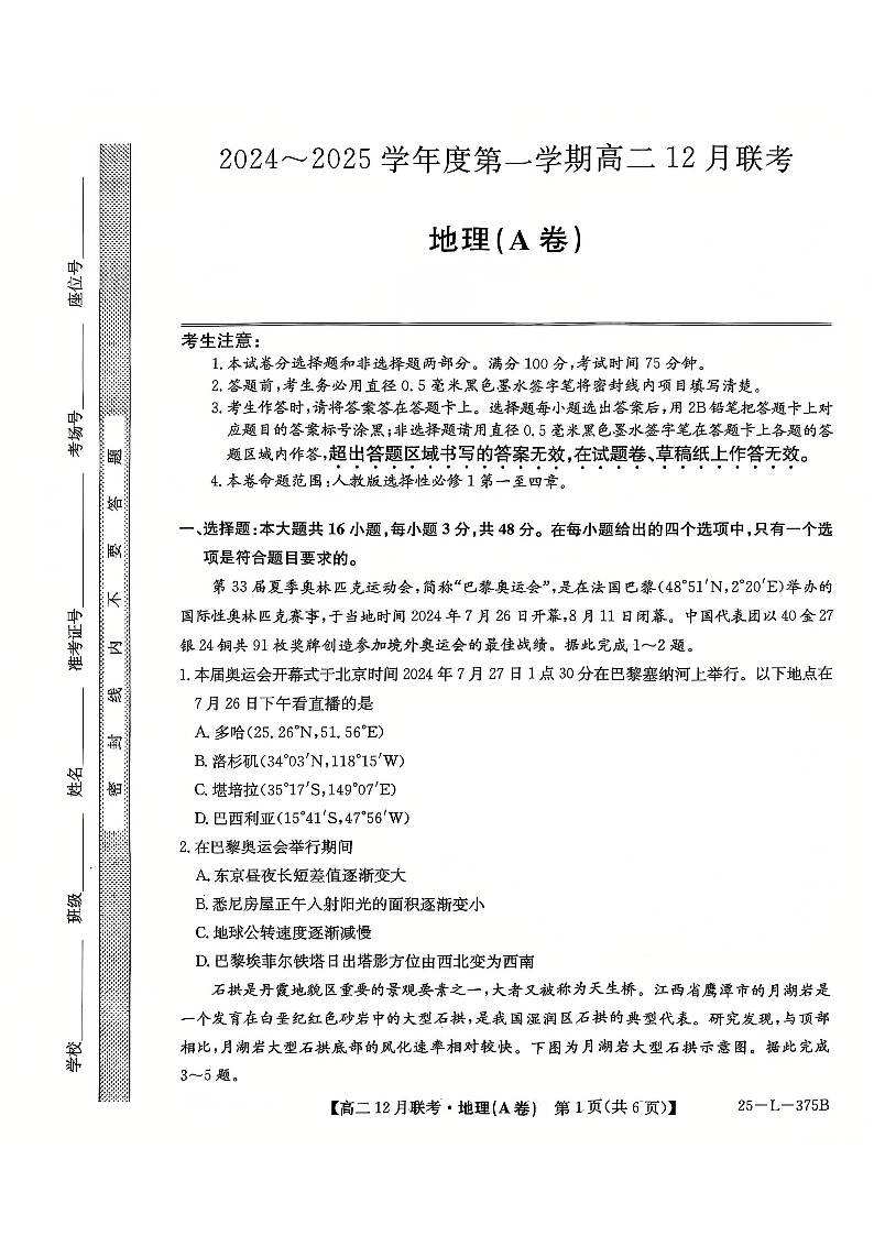 安徽省县中联盟2024-2025学年高二上学期12月月考地理(A卷)