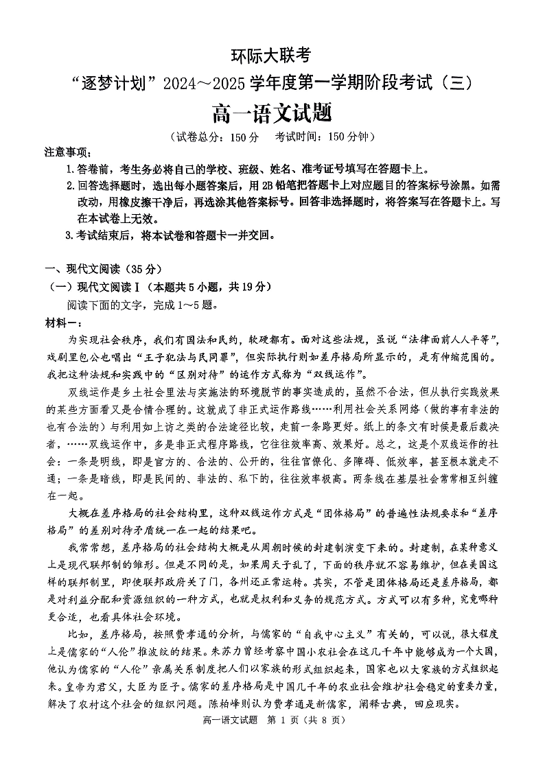 河南省环际大联考“逐梦计划”2024-2025学年上学期高一阶段性考试(三)语文