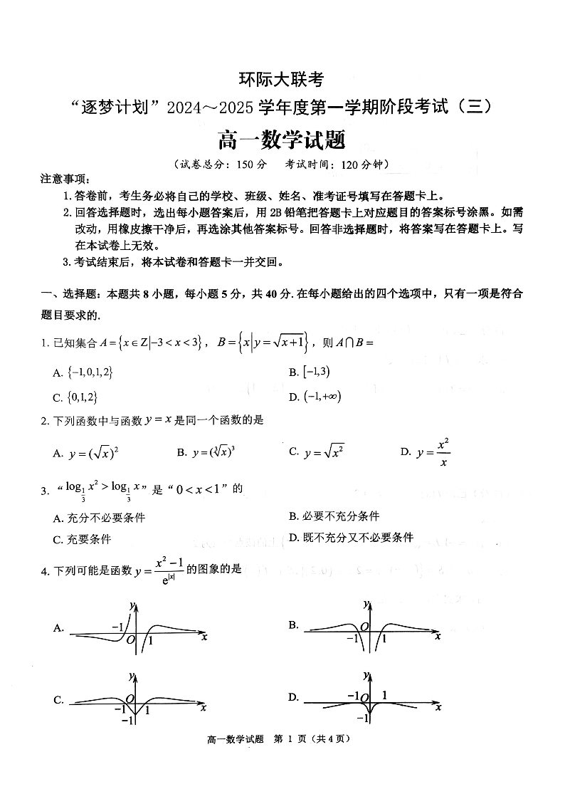 河南省环际大联考“逐梦计划”2024-2025学年上学期高一阶段性考试(三)数学
