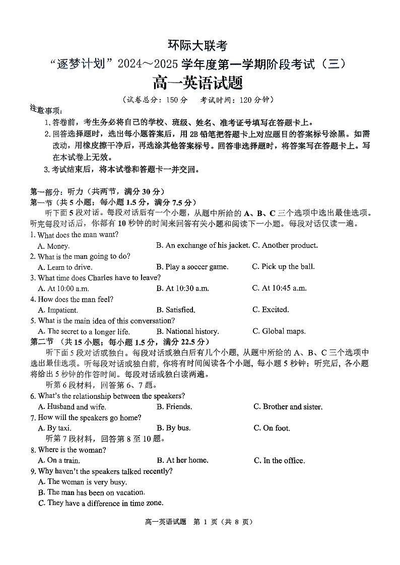 河南省环际大联考“逐梦计划”2024-2025学年上学期高一阶段性考试(三)英语