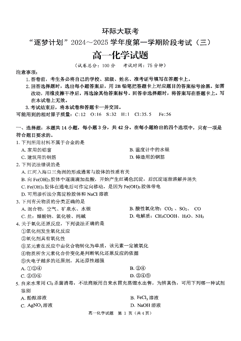河南省环际大联考“逐梦计划”2024-2025学年上学期高一阶段性考试(三)化学