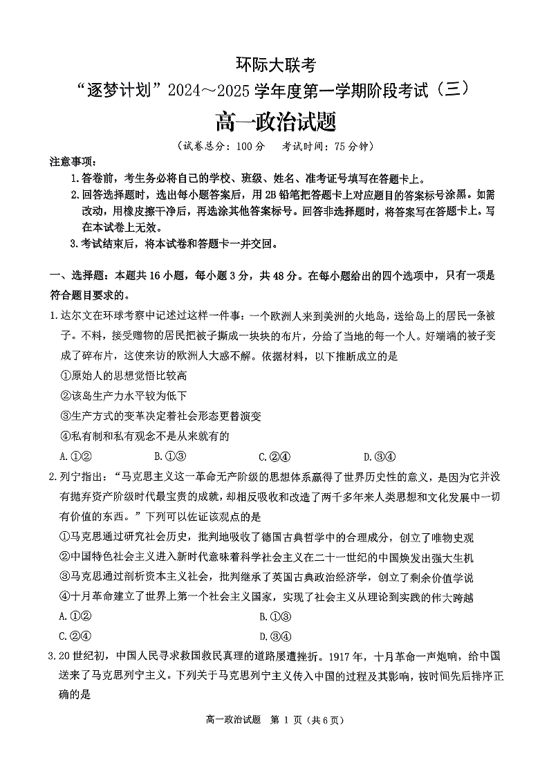 河南省环际大联考“逐梦计划”2024-2025学年上学期高一阶段性考试(三)政治