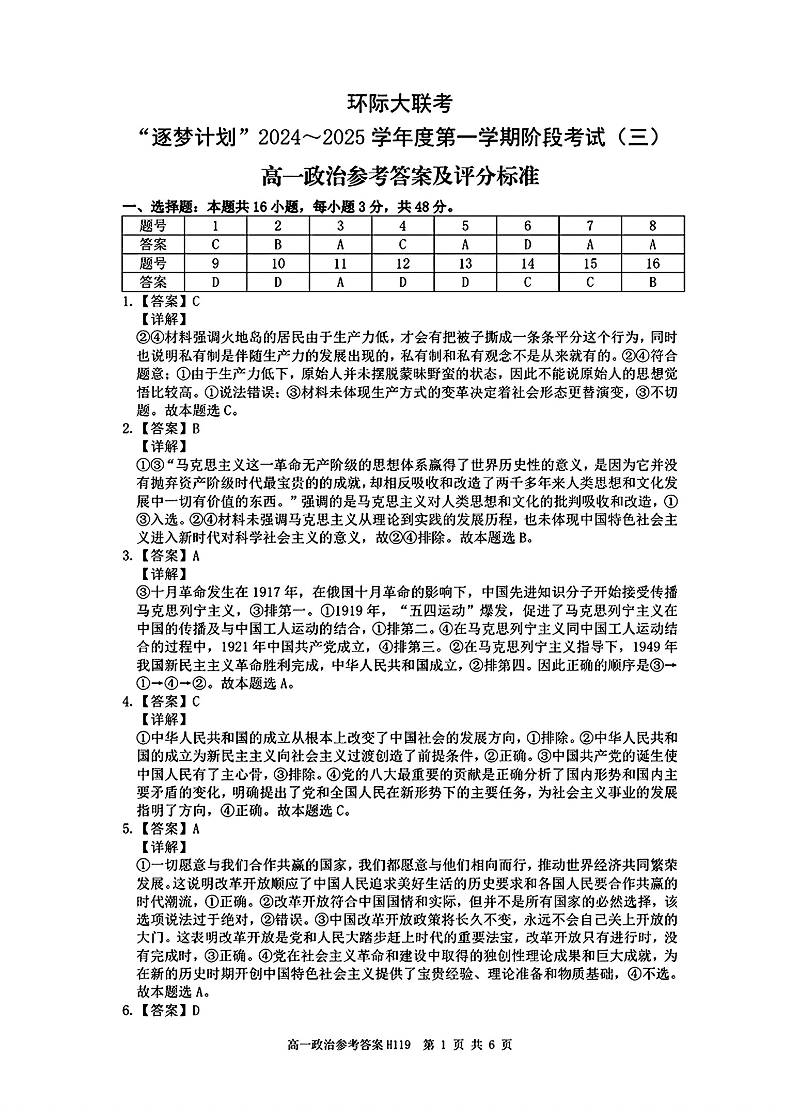 河南省环际大联考“逐梦计划”2024-2025学年上学期高一阶段性考试(三)政治答案