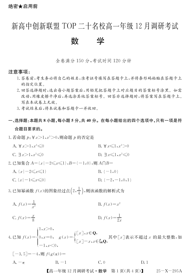 河南省TOP二十名校2024-2025学年高一上学期12月调研考试数学