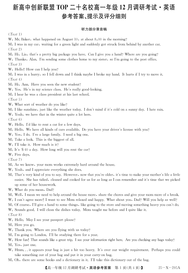河南省TOP二十名校2024-2025学年高一上学期12月调研考试英语答案