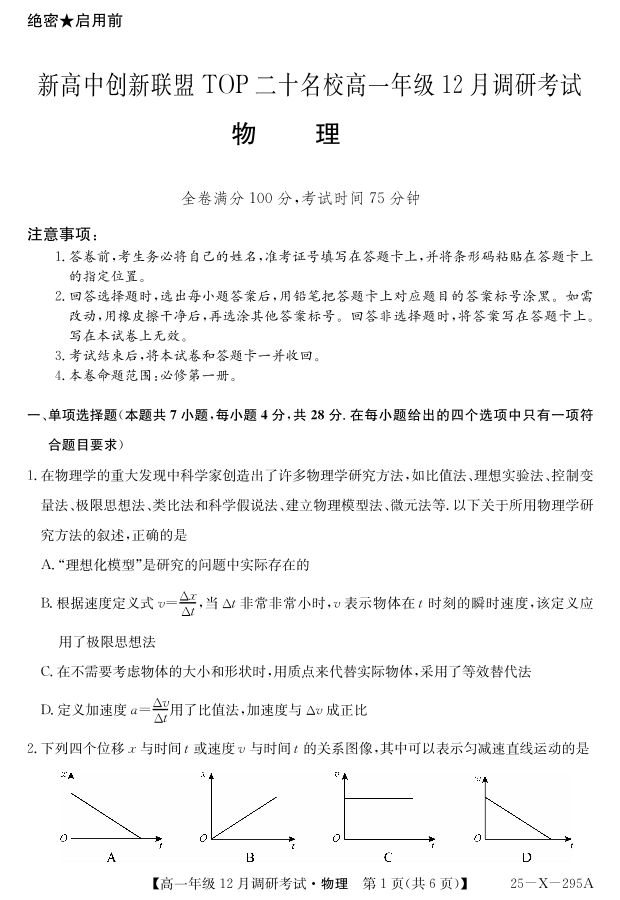河南省TOP二十名校2024-2025学年高一上学期12月调研考试物理