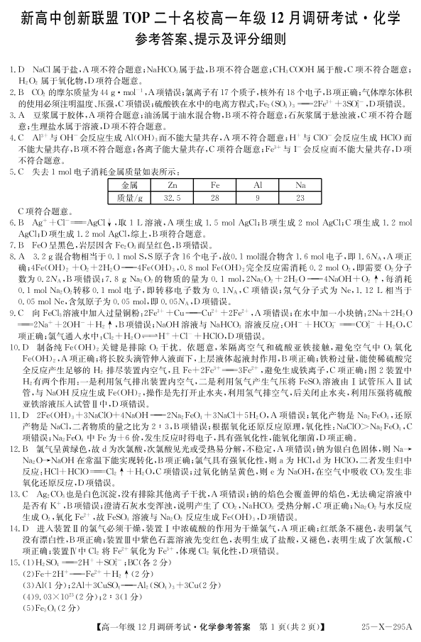 河南省TOP二十名校2024-2025学年高一上学期12月调研考试化学答案