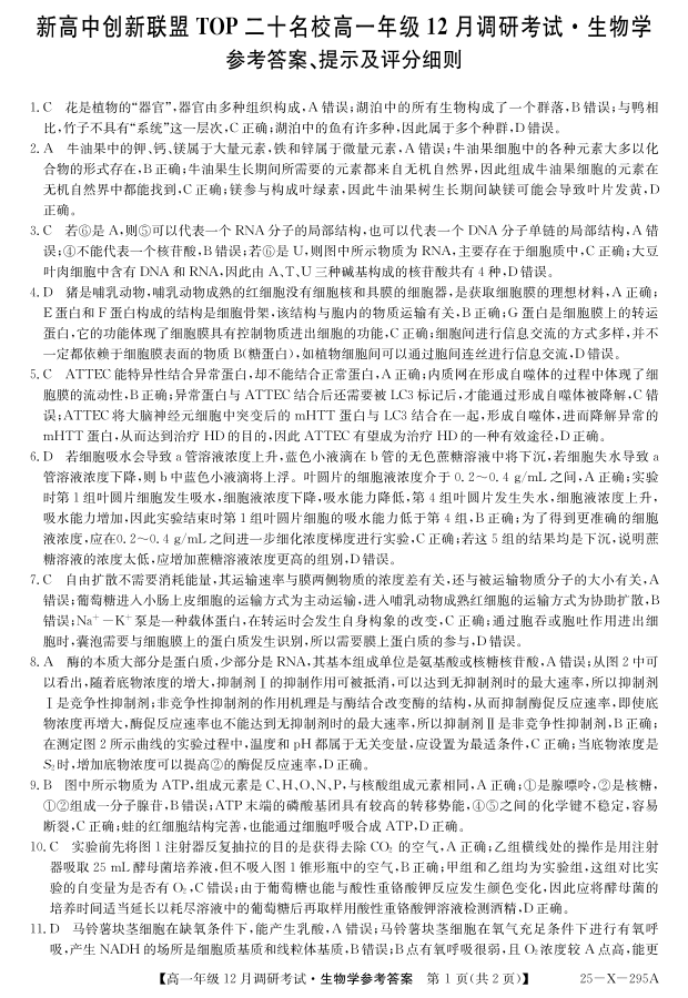 河南省TOP二十名校2024-2025学年高一上学期12月调研考试生物答案