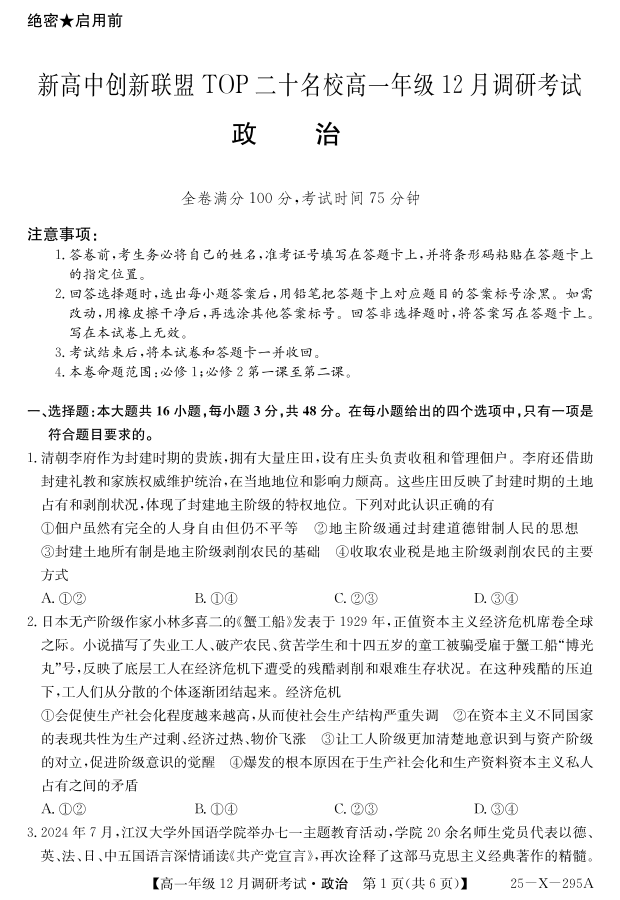 河南省TOP二十名校2024-2025学年高一上学期12月调研考试政治