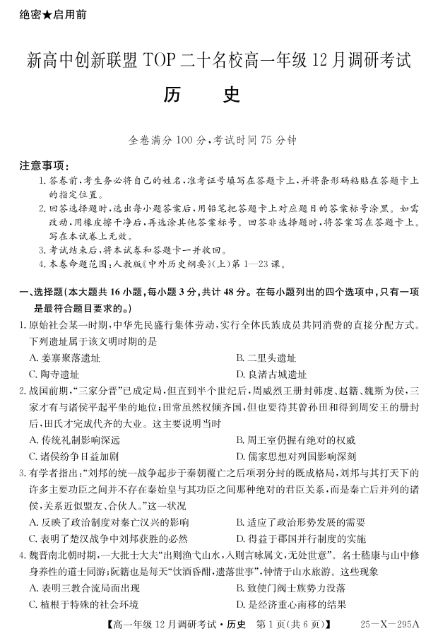 河南省TOP二十名校2024-2025学年高一上学期12月调研考试历史