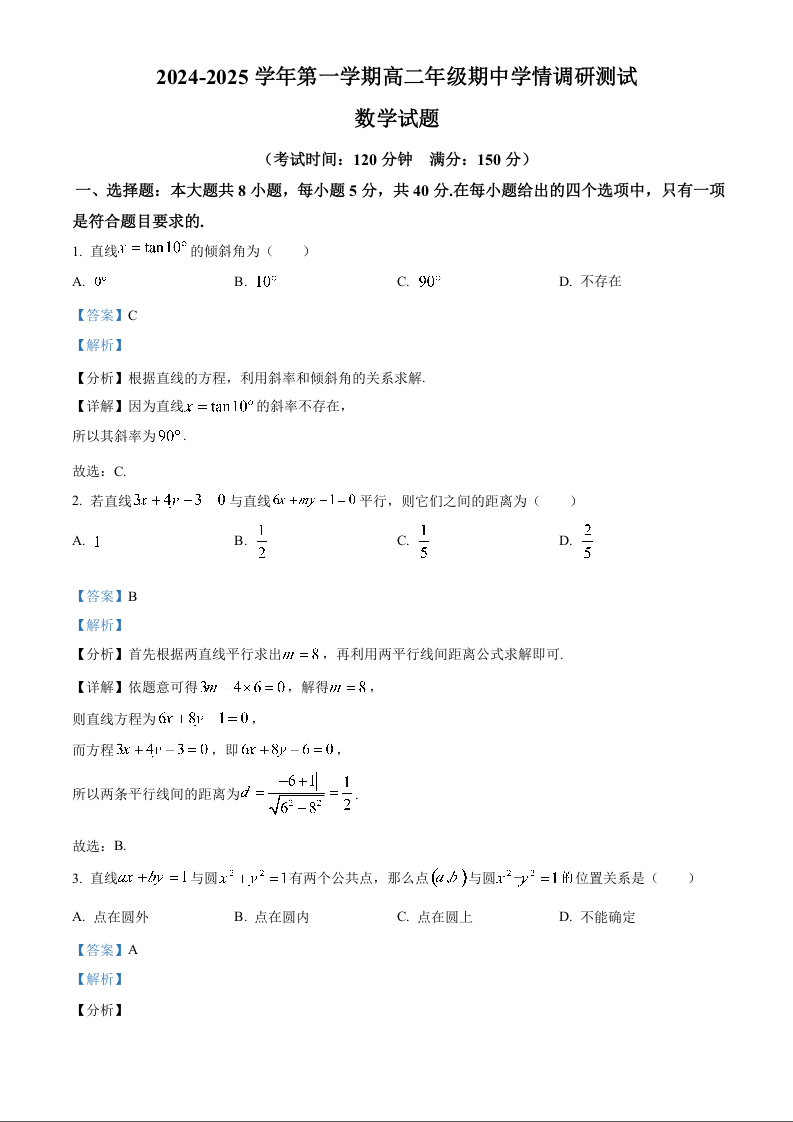 江苏省扬州市高邮市2024-2025学年高二上学期11月期中考试数学(解析版)