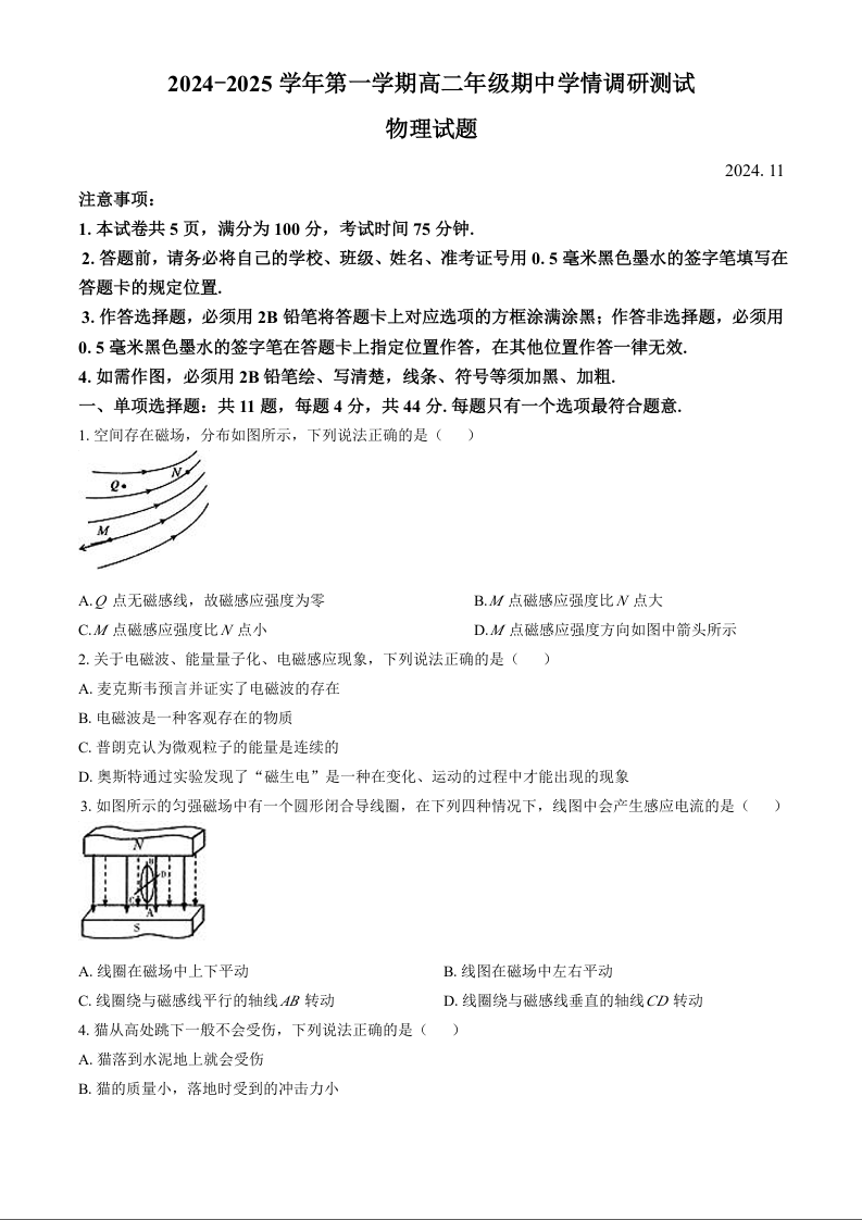 江苏省扬州市高邮市2024-2025学年高二上学期11月期中考试物理+答案