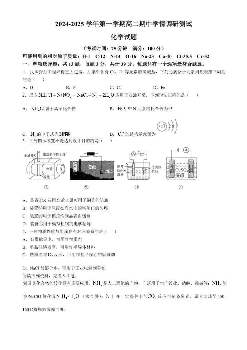江苏省扬州市高邮市2024-2025学年高二上学期11月期中考试化学+答案