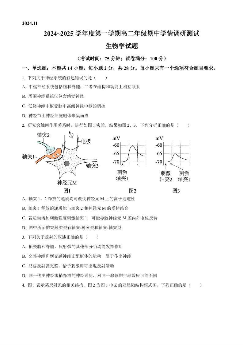 江苏省扬州市高邮市2024-2025学年高二上学期11月期中考试生物(原卷版)