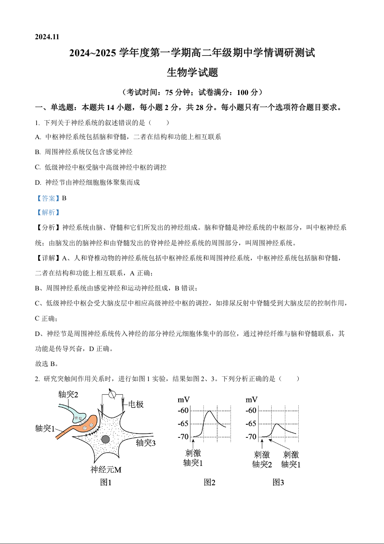 江苏省扬州市高邮市2024-2025学年高二上学期11月期中考试生物(解析版)