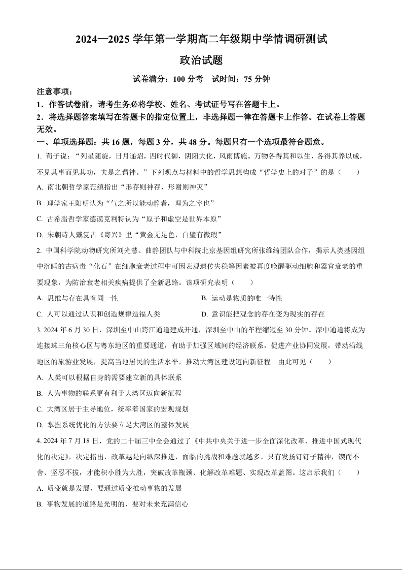 江苏省扬州市高邮市2024-2025学年高二上学期11月期中考试政治(原卷版)