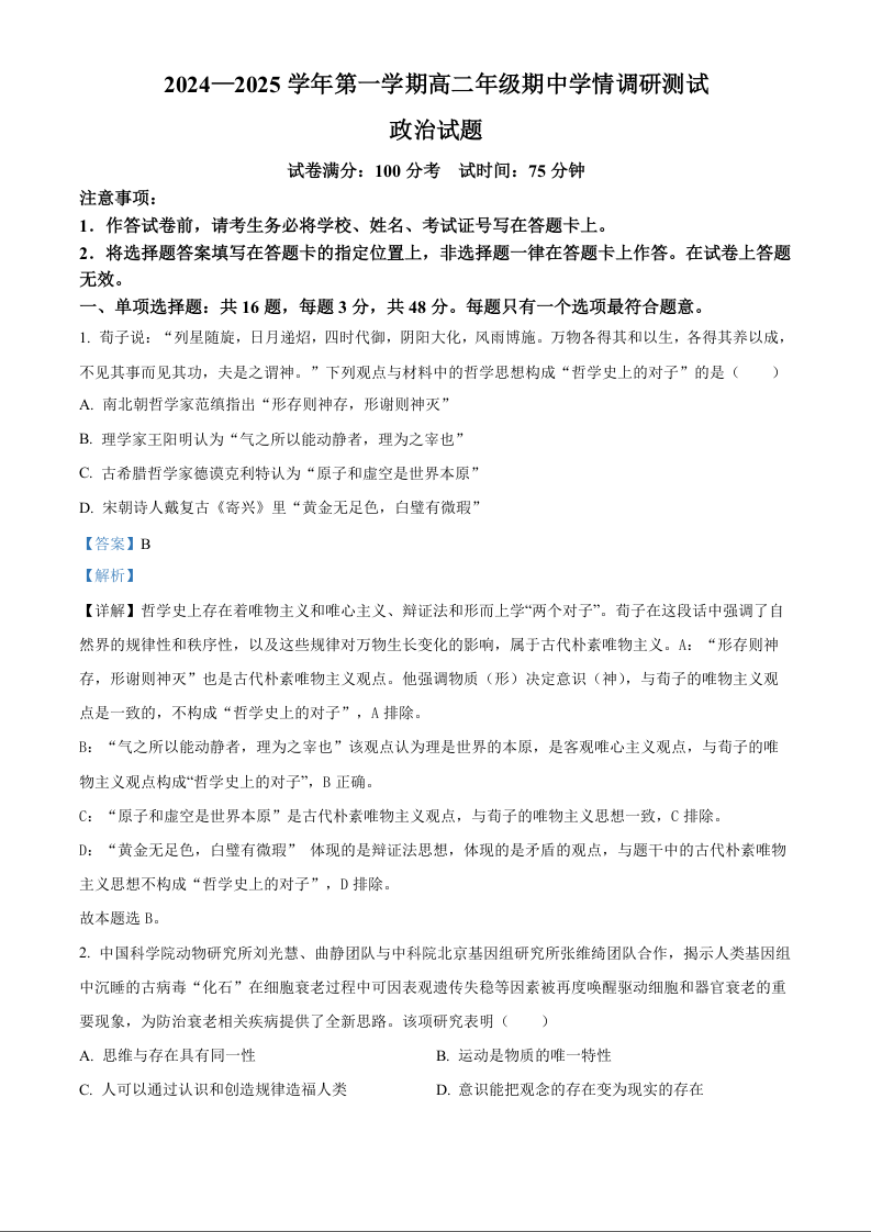 江苏省扬州市高邮市2024-2025学年高二上学期11月期中考试政治(解析版)