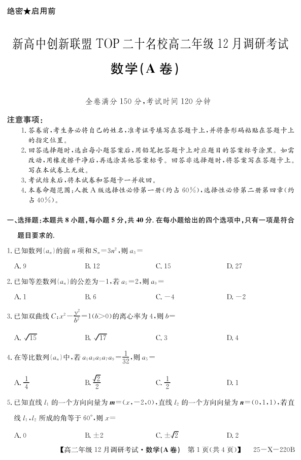 河南省TOP二十名校2024-2025学年高二上学期12月调研考试数学RJA