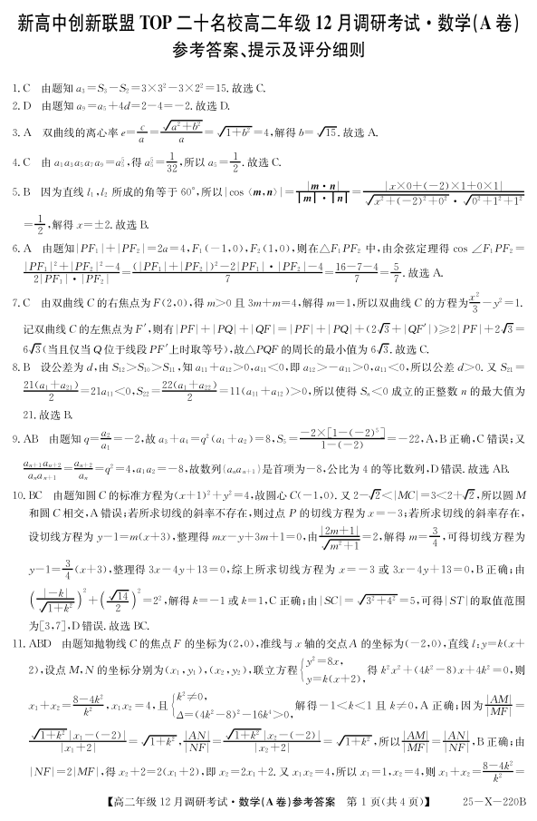 河南省TOP二十名校2024-2025学年高二上学期12月调研考试数学RJA答案