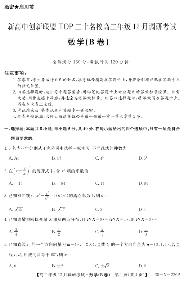 河南省TOP二十名校2024-2025学年高二上学期12月调研考试数学BSD