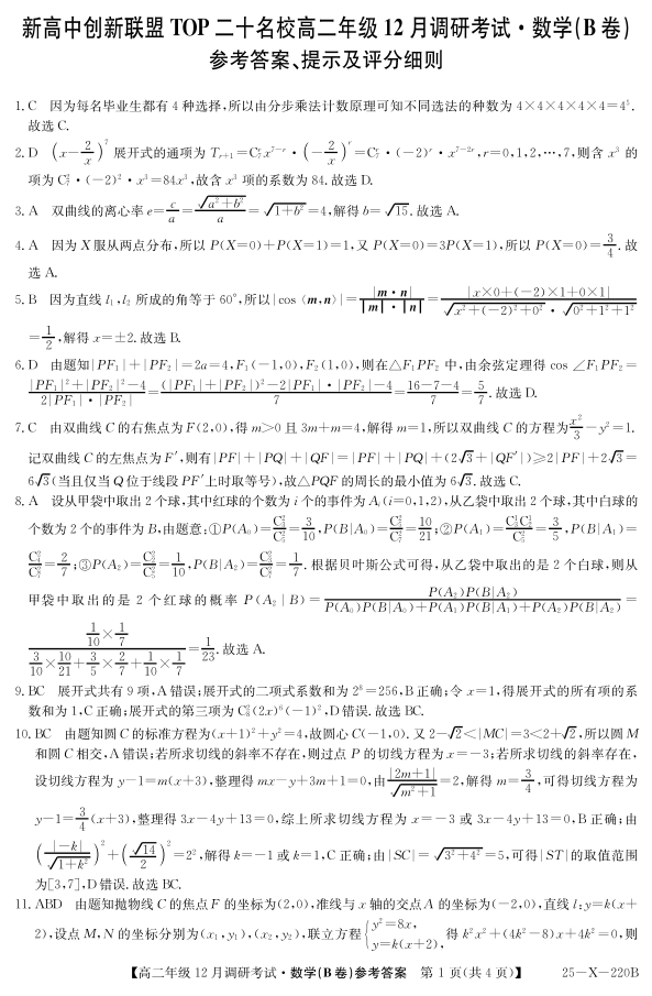 河南省TOP二十名校2024-2025学年高二上学期12月调研考试数学BSD答案