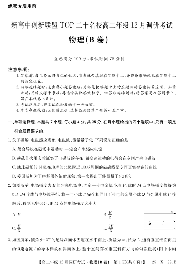 河南省TOP二十名校2024-2025学年高二上学期12月调研考试物理B