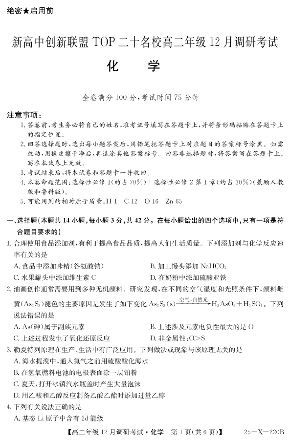 河南省TOP二十名校2024-2025学年高二上学期12月调研考试化学