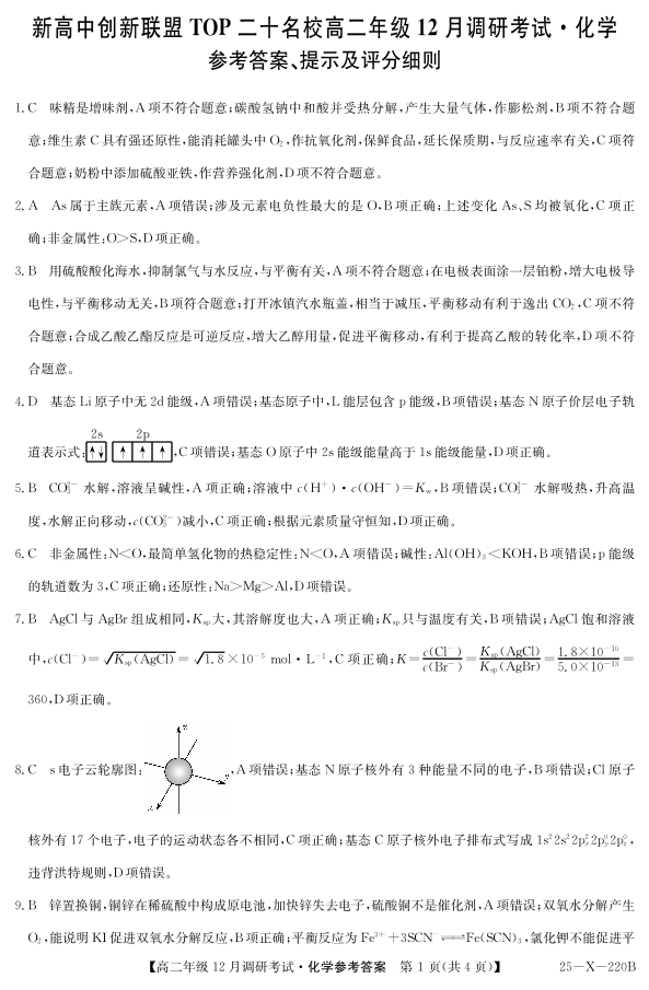 河南省TOP二十名校2024-2025学年高二上学期12月调研考试化学答案