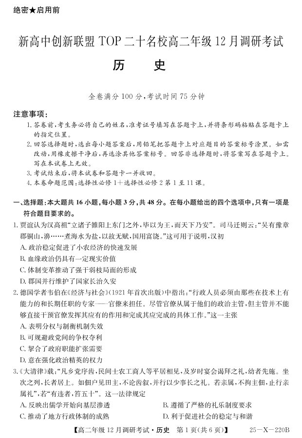 河南省TOP二十名校2024-2025学年高二上学期12月调研考试历史