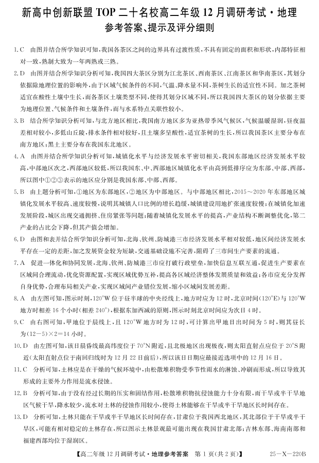河南省TOP二十名校2024-2025学年高二上学期12月调研考试地理答案