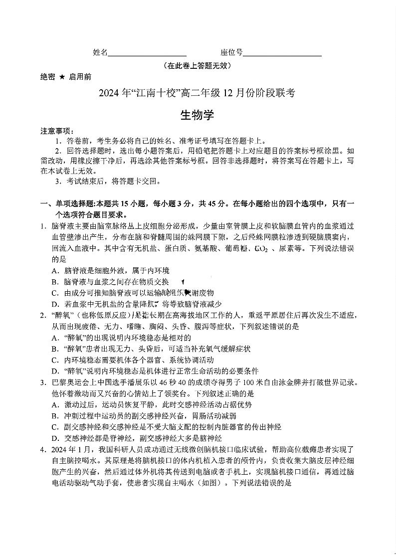 安徽省“江南十校”2024年高二年级12月份阶段联考生物