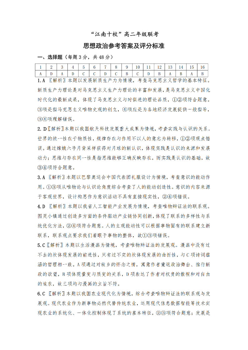 安徽省“江南十校”2024年高二年级12月份阶段联考政治答案