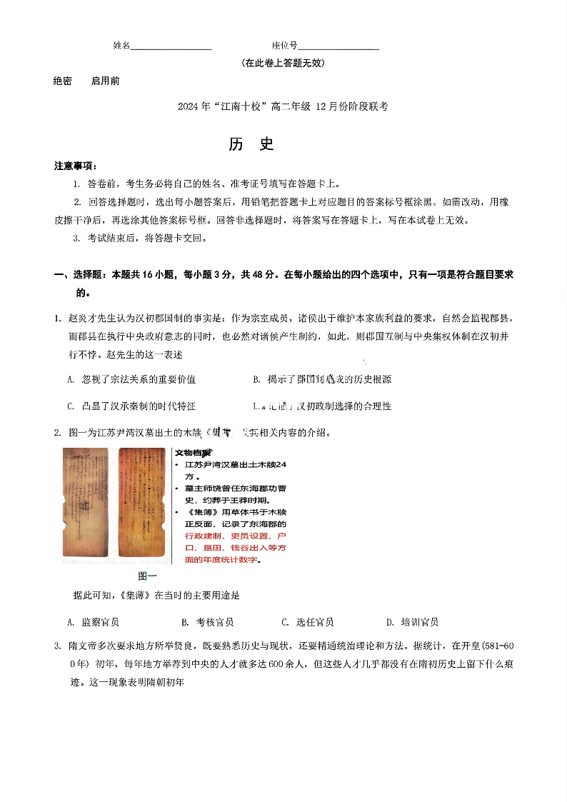 安徽省“江南十校”2024年高二年级12月份阶段联考历史