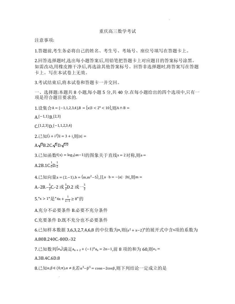 重庆市区域高中2025届高三年级12月联考测试数学答案