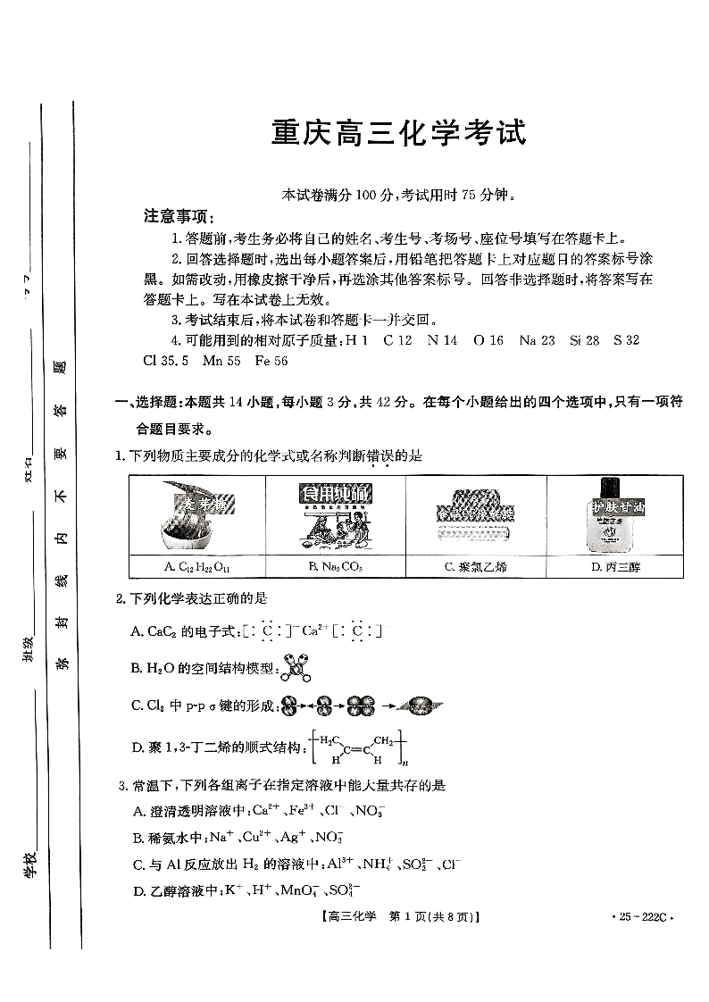 重庆市区域高中2025届高三年级12月联考测试化学