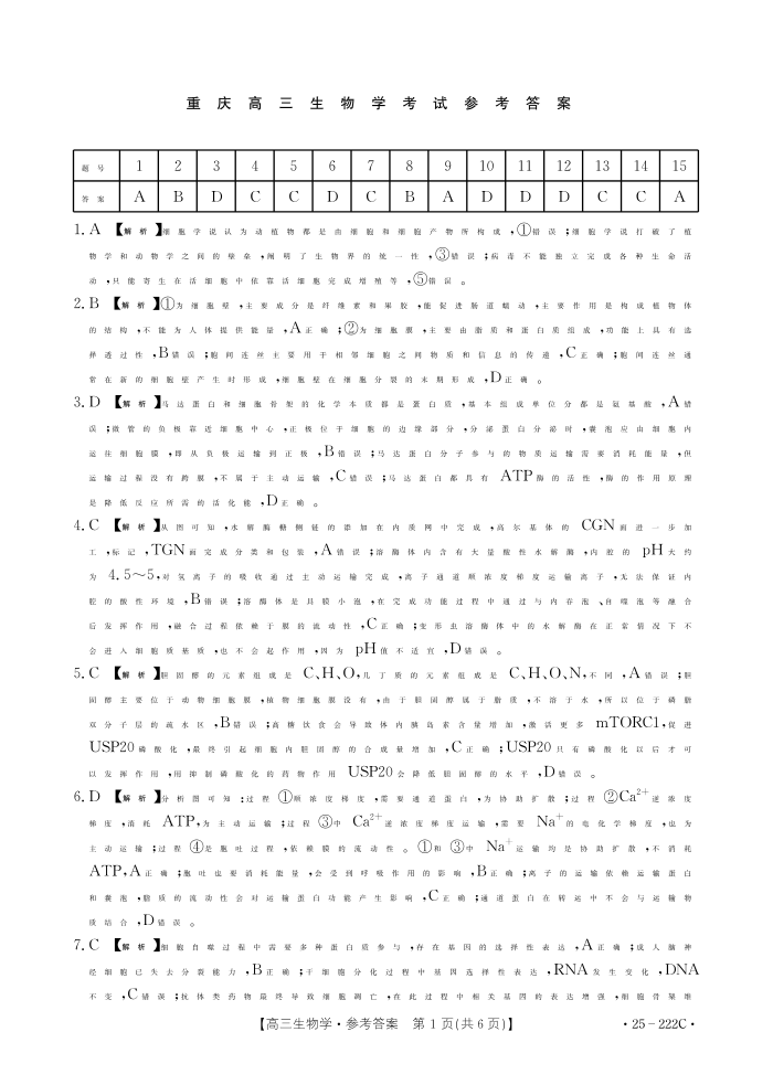 重庆市区域高中2025届高三年级12月联考测试生物答案