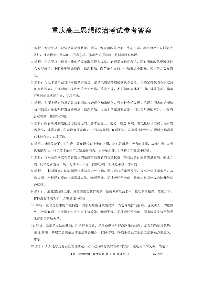 重庆市区域高中2025届高三年级12月联考测试政治答案