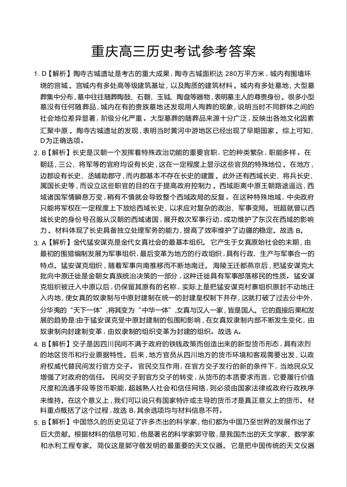 重庆市区域高中2025届高三年级12月联考测试历史答案