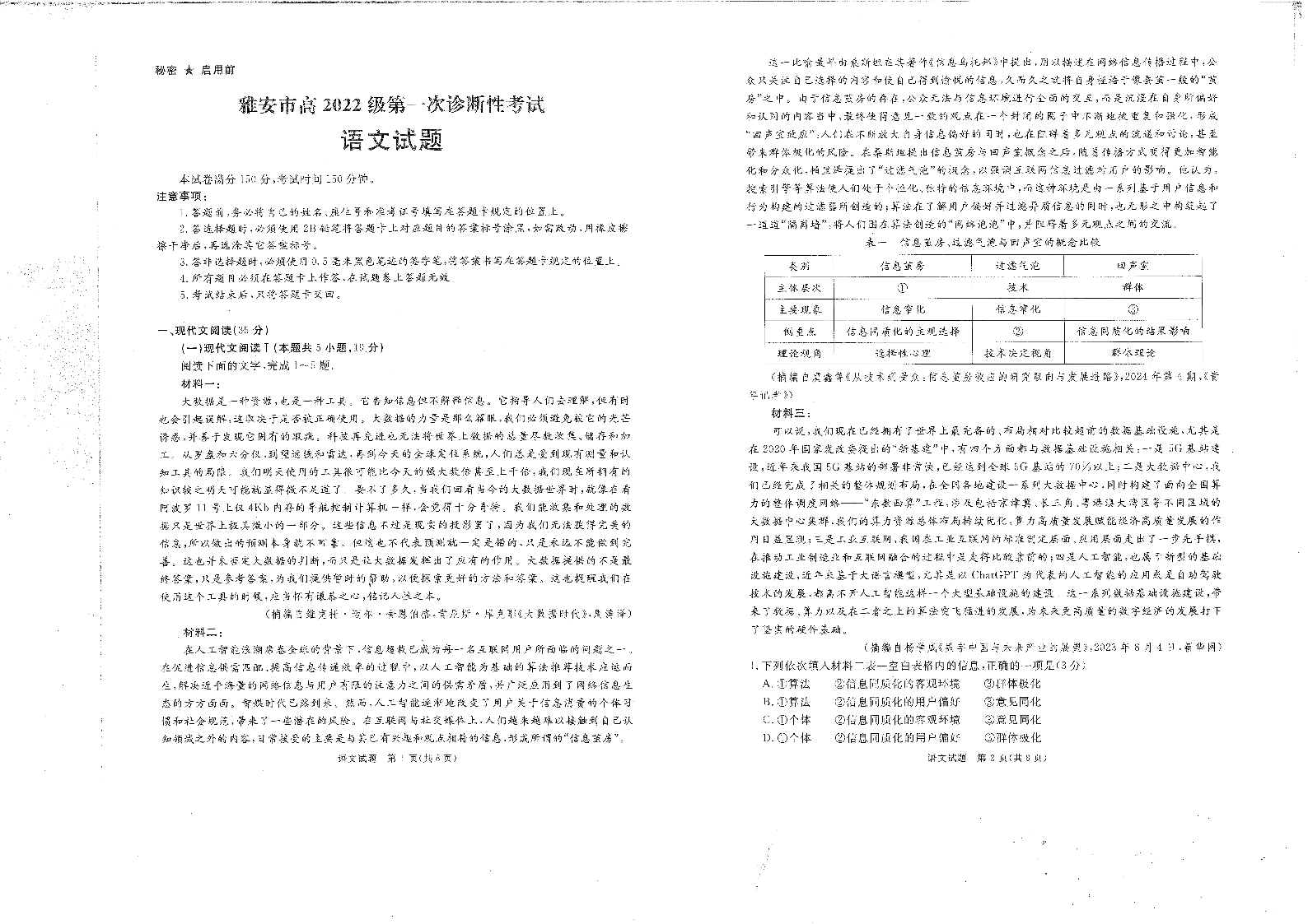 四川省雅安市等九市2025届高三年级第一次诊断性考试语文