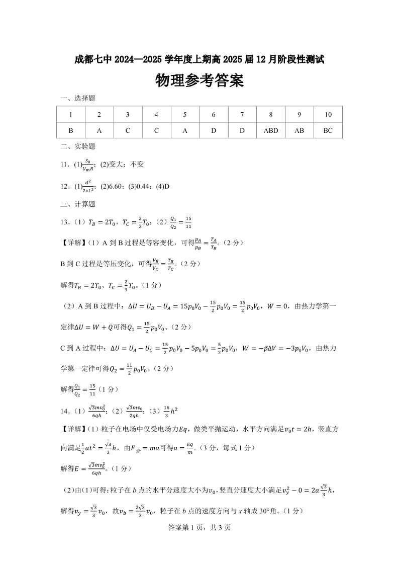 四川省成都市第七中学2025届高三上学期12月阶段性考试物理答案