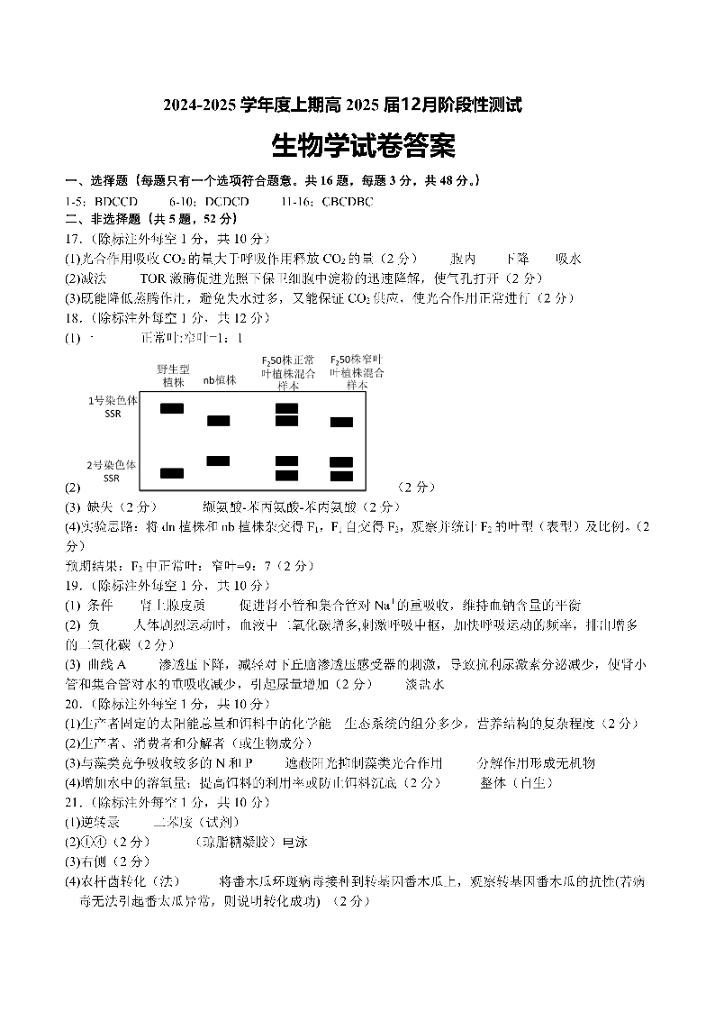 四川省成都市第七中学2025届高三上学期12月阶段性考试生物答案