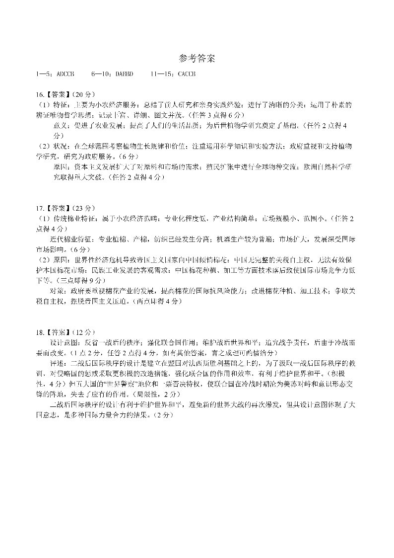 四川省成都市第七中学2025届高三上学期12月阶段性考试历史答案