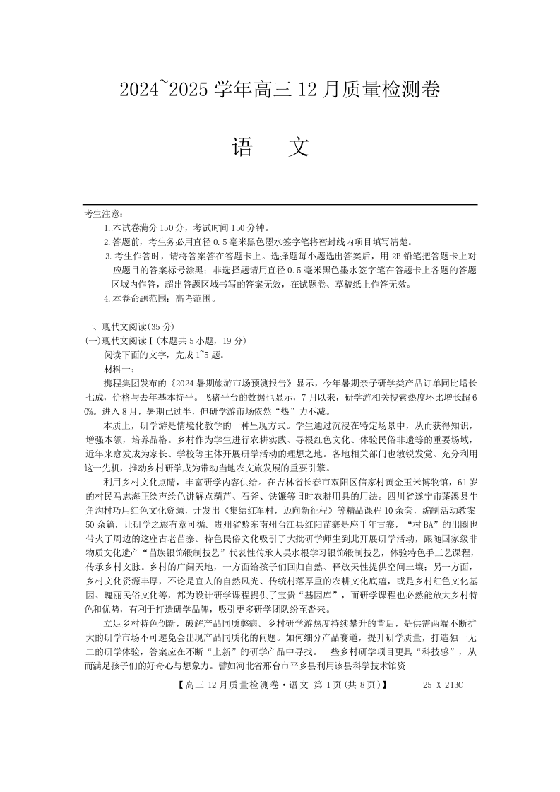 山西省卓越联盟区域高中2025届高三12月质量检测语文+答案