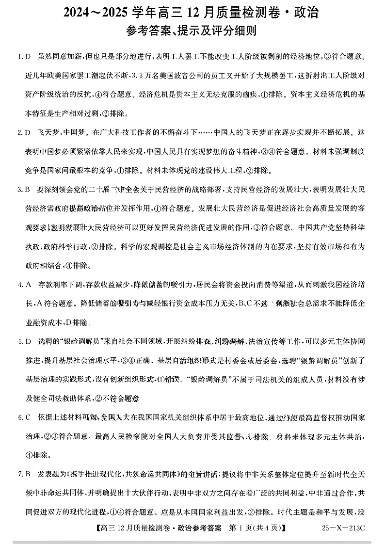 山西省卓越联盟区域高中2025届高三12月质量检测政治答案